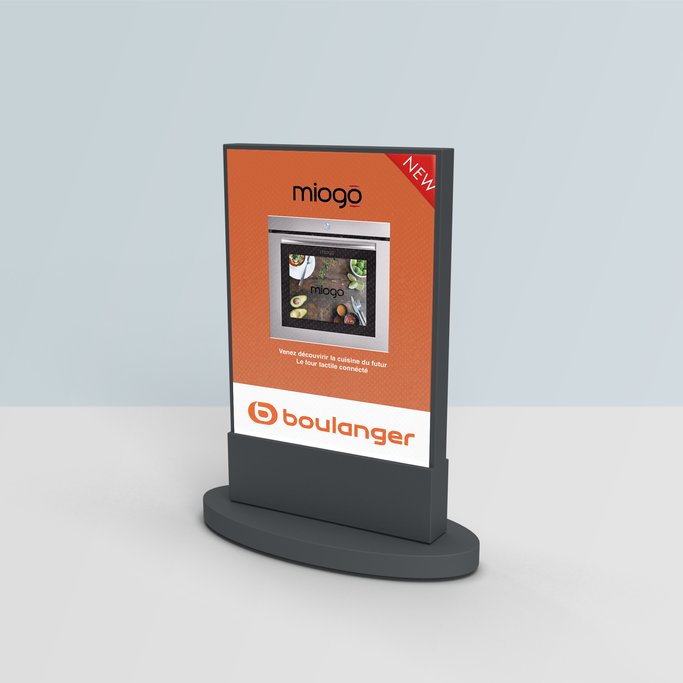 Communication pour la sortie d’un nouveau produit de la marque miogo chez Boulanger. Objectif: mise en avant de la marque et du revendeur. Deux types de supports: un kakémono et un panneaux lumineux pour la devanture du magasin ainsi que le rayon d’emplacement du produit.